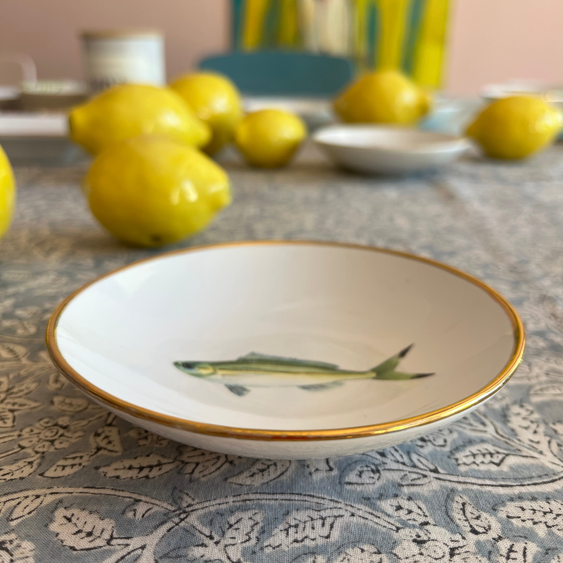 Runde Porzellan-Schale mit Fisch Motiv, grün und Goldrand.