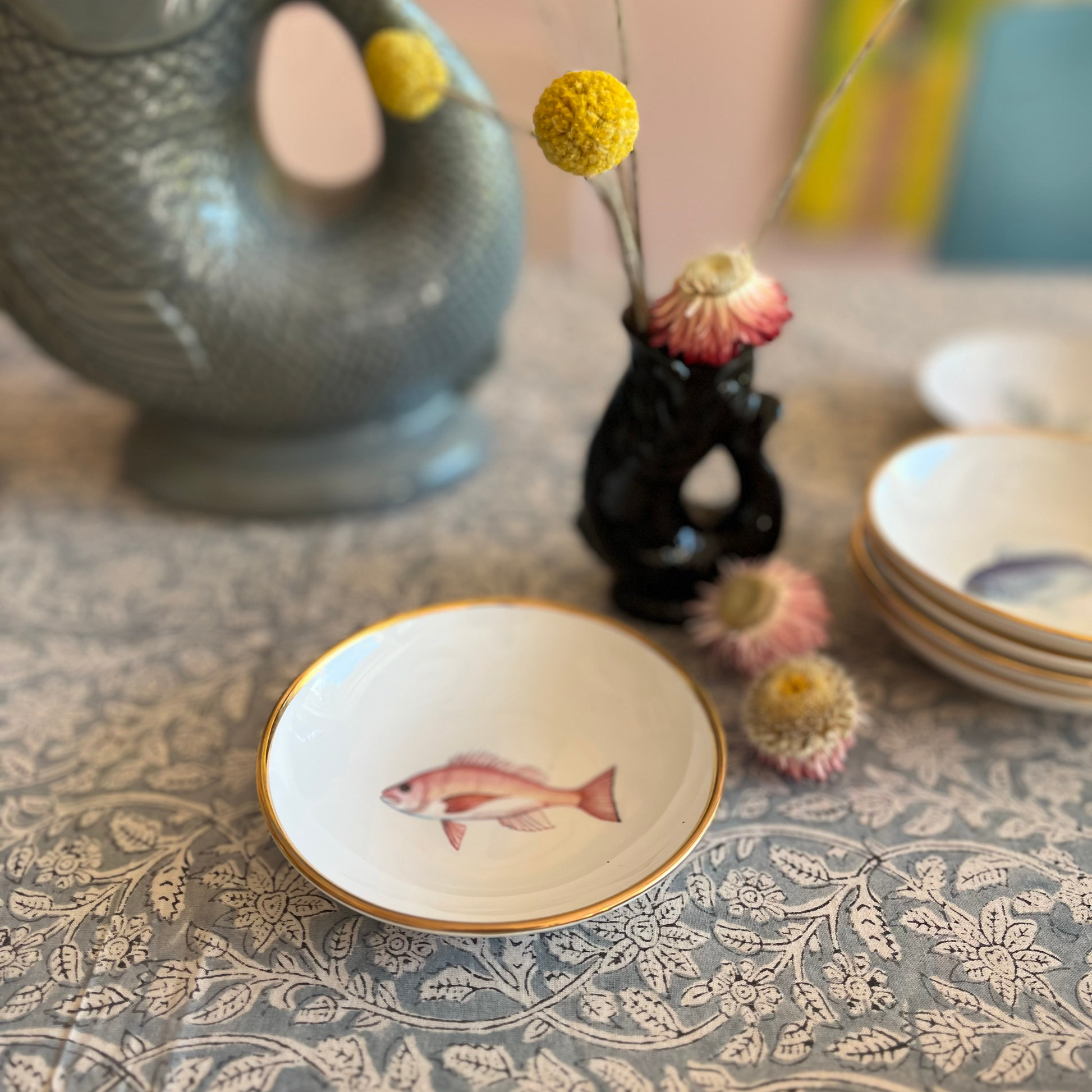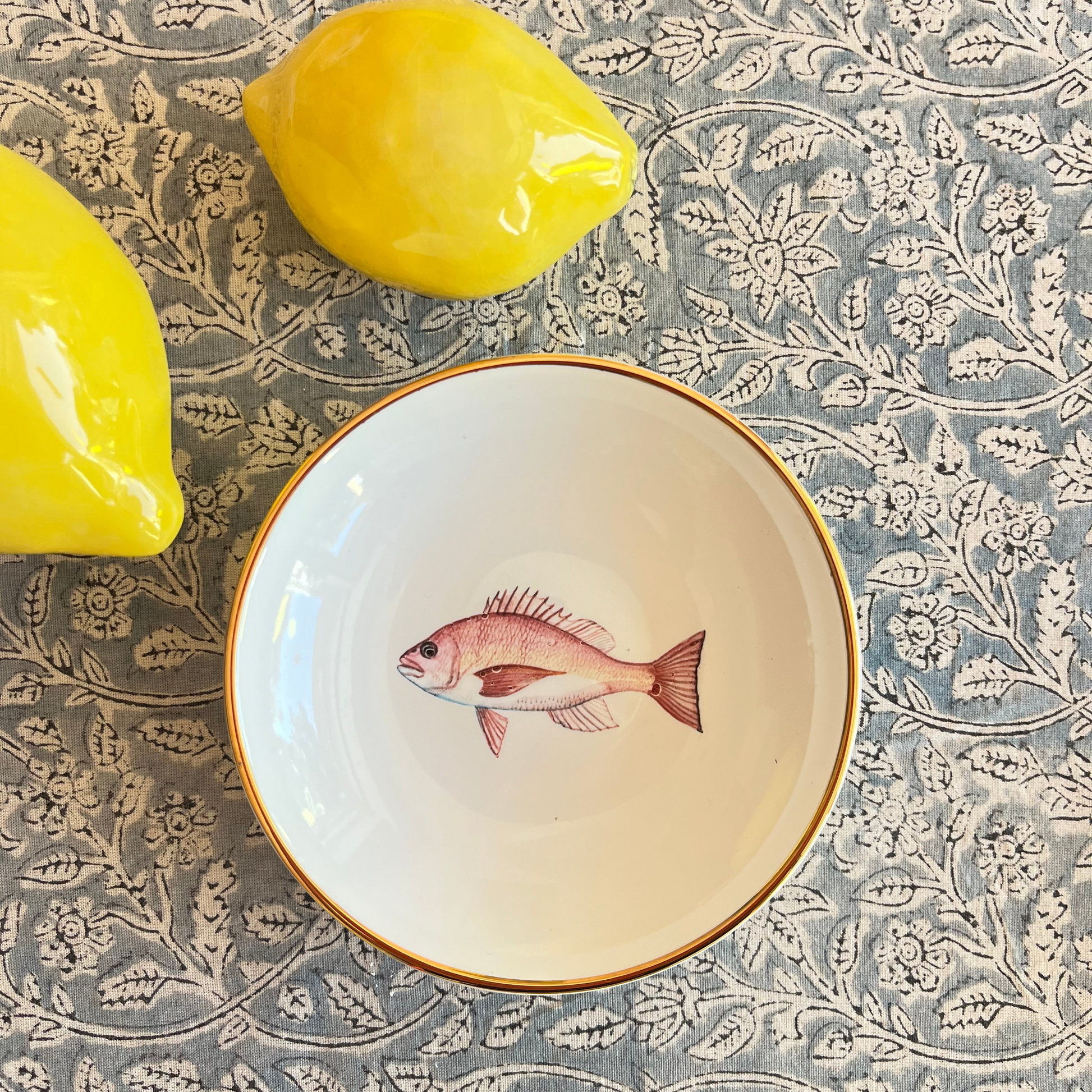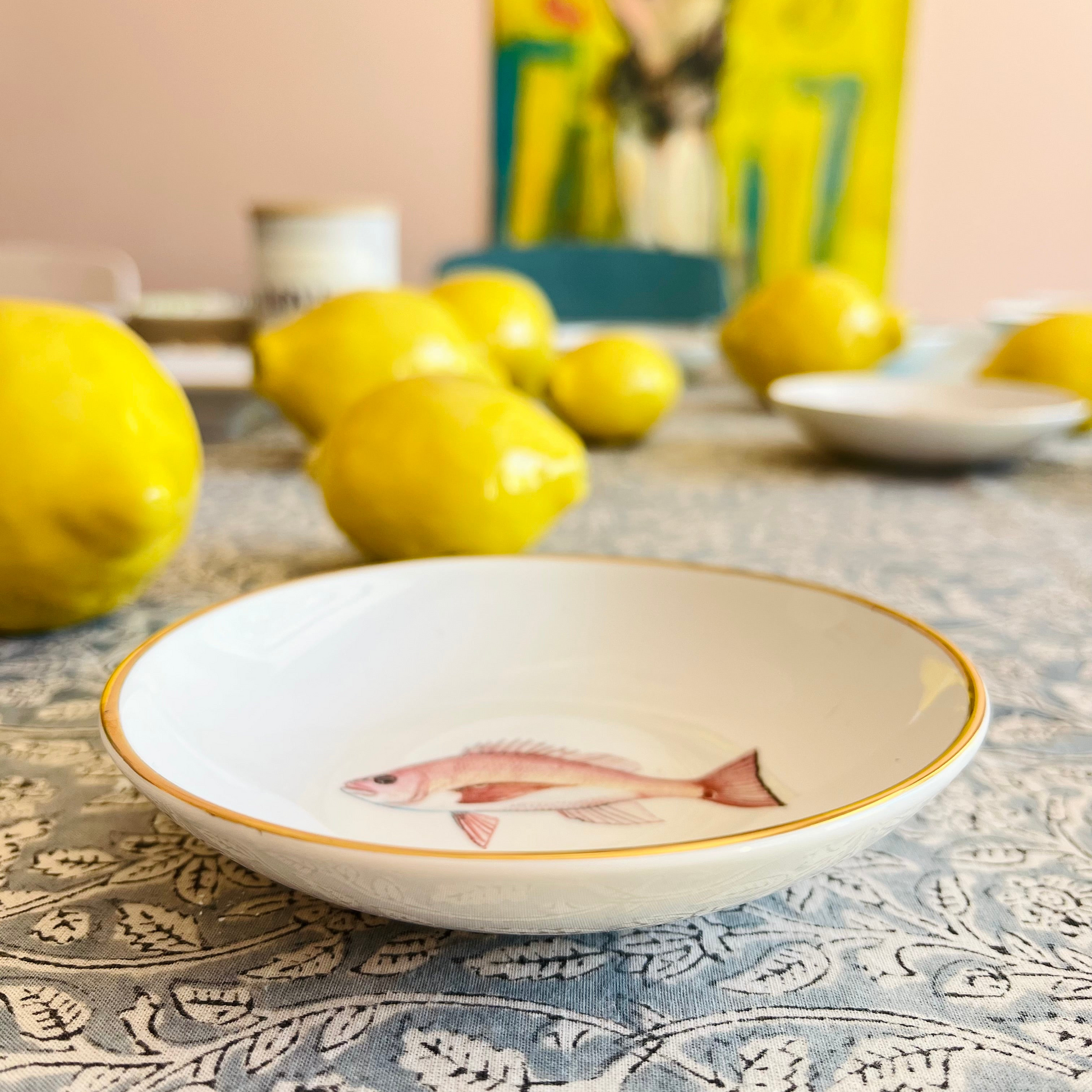 Runde Porzellan-Schale mit Fisch Motiv und Goldrand.
