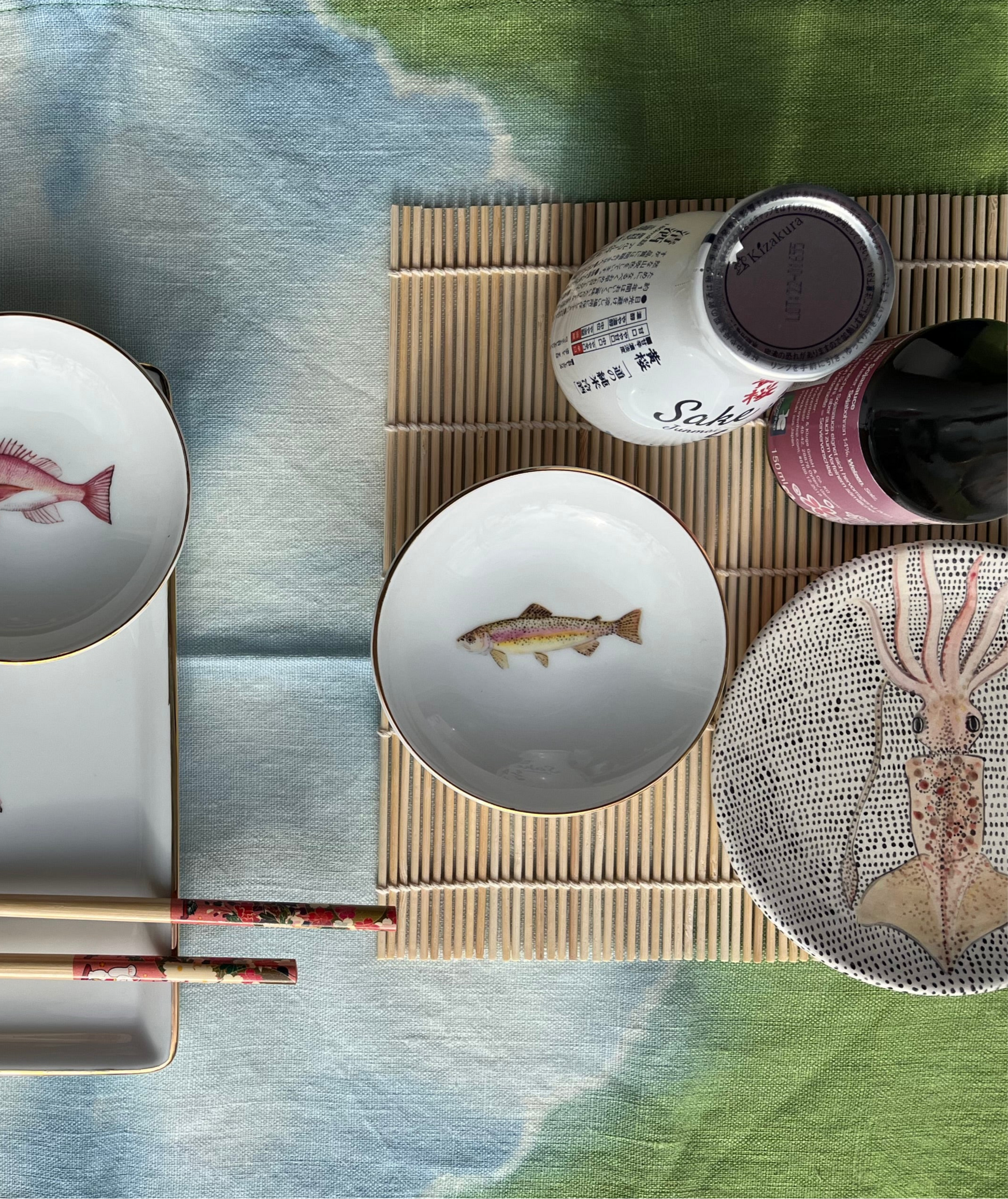 Porzellanschälchen mit Fisch, rot und Goldrand.