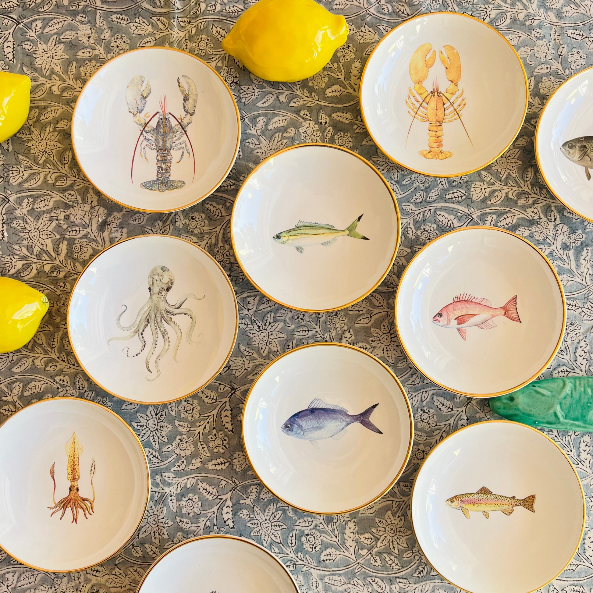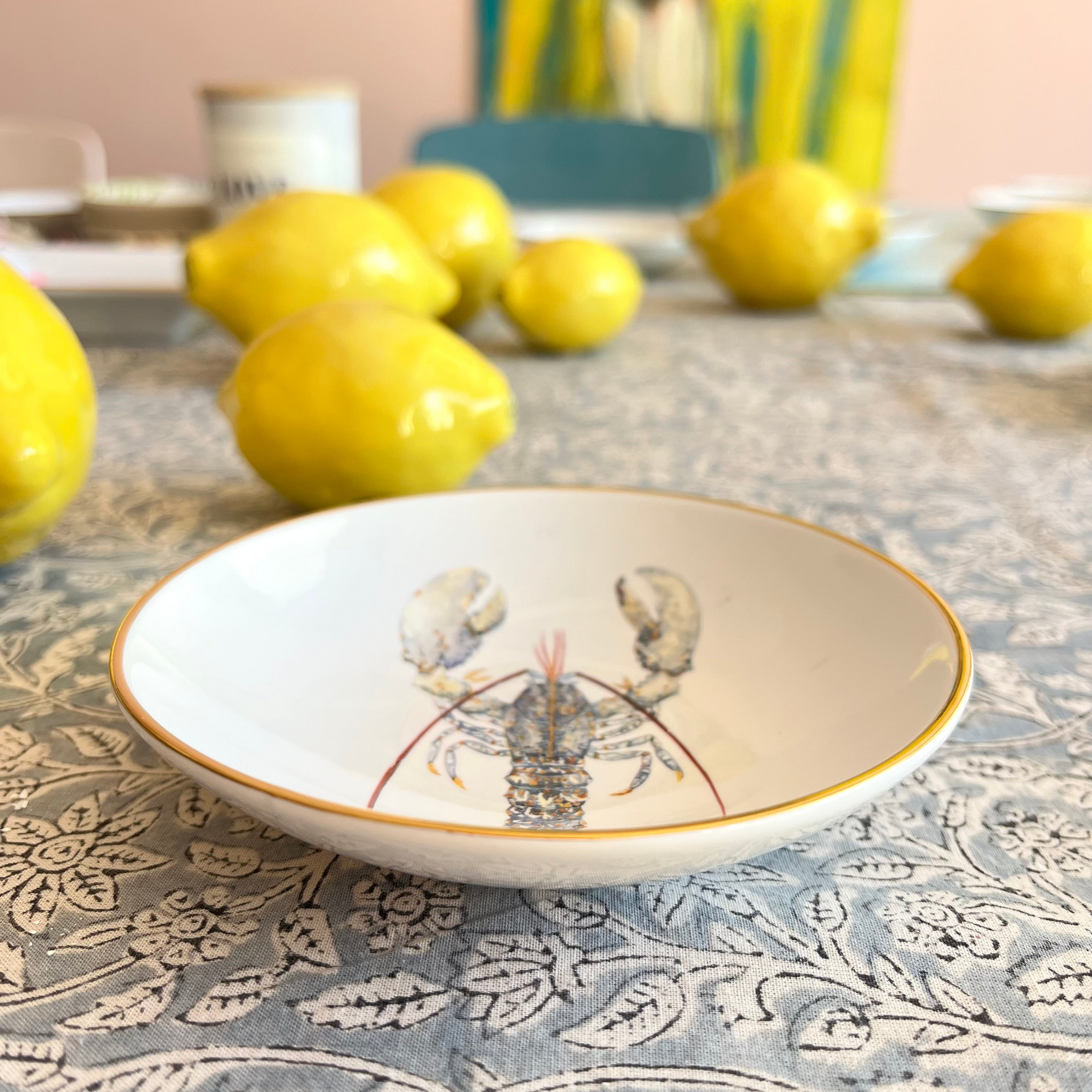 Runde Porzellan-Schale mit Hummer- Motiv und Goldrand.