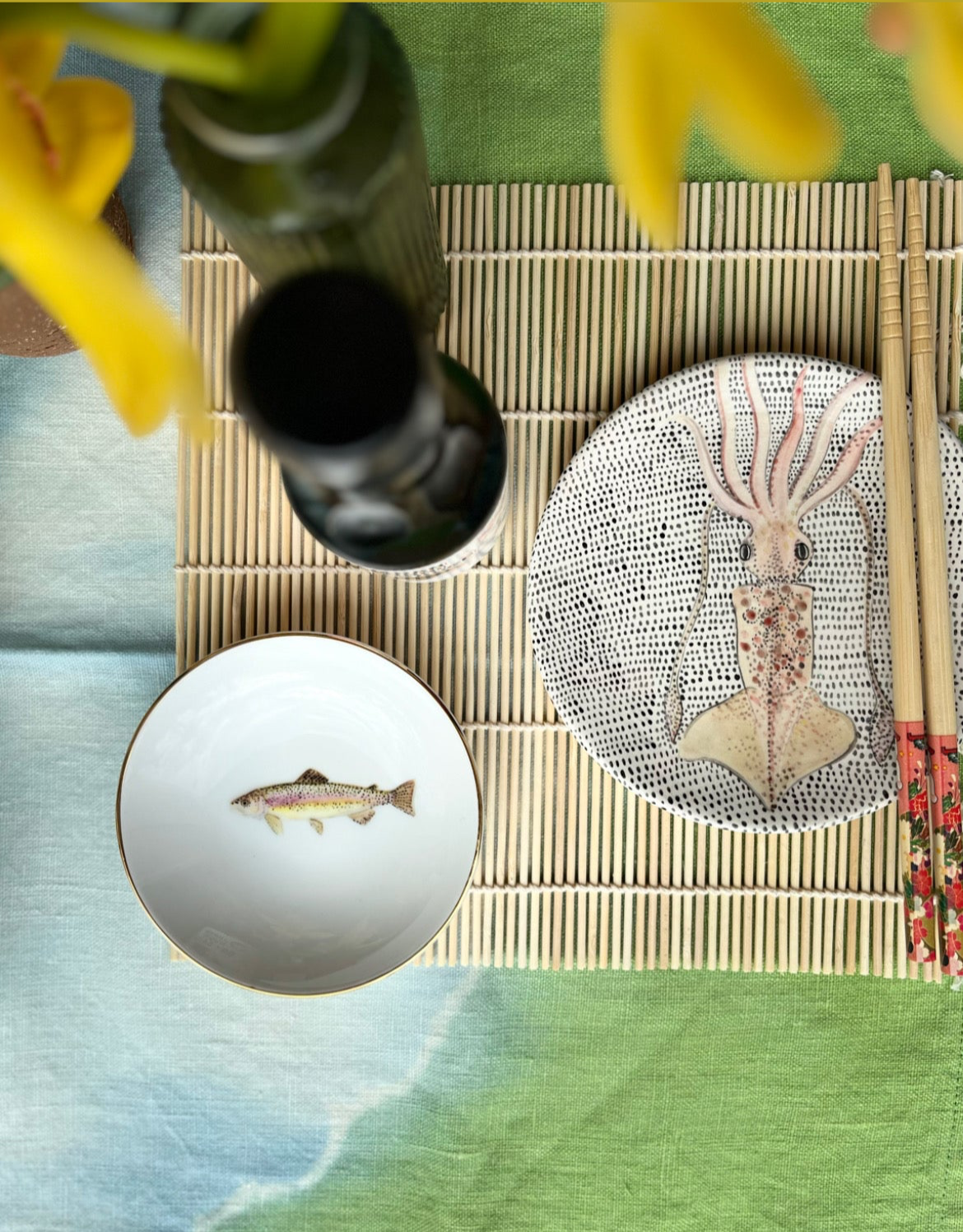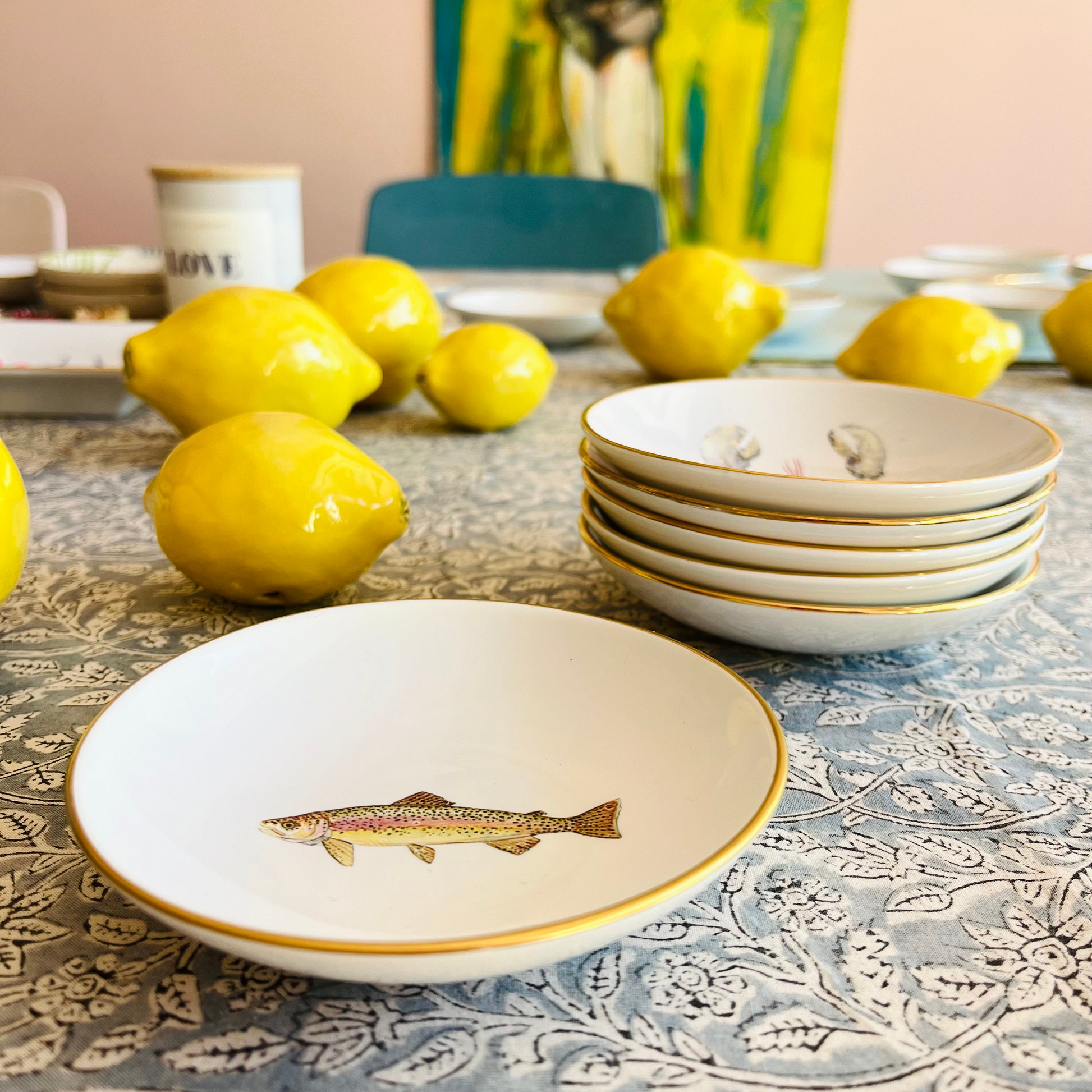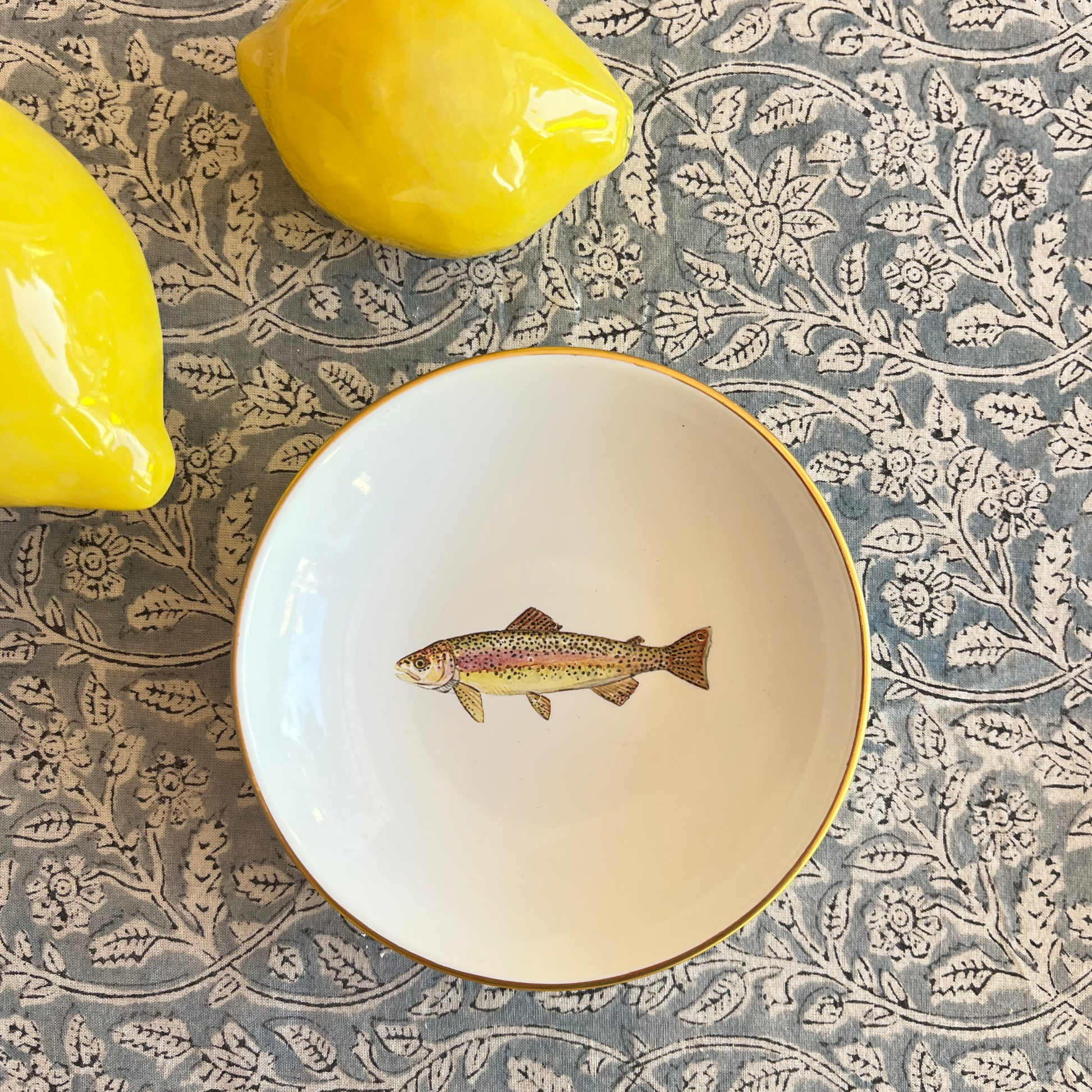 Runde Porzellan-Schale mit Regenbogenforellen- Motiv und Goldrand.