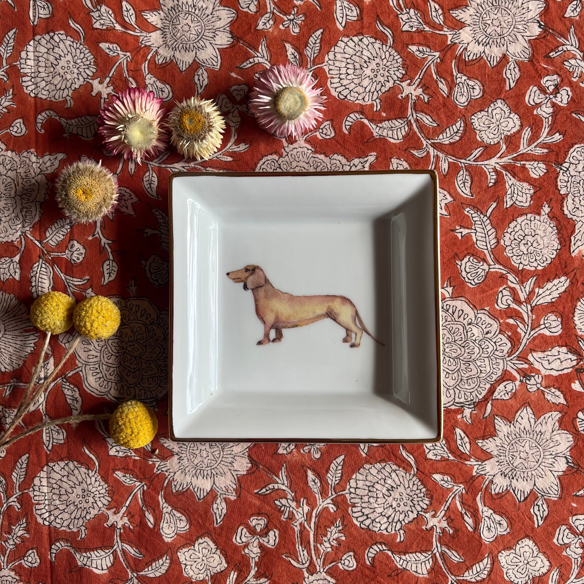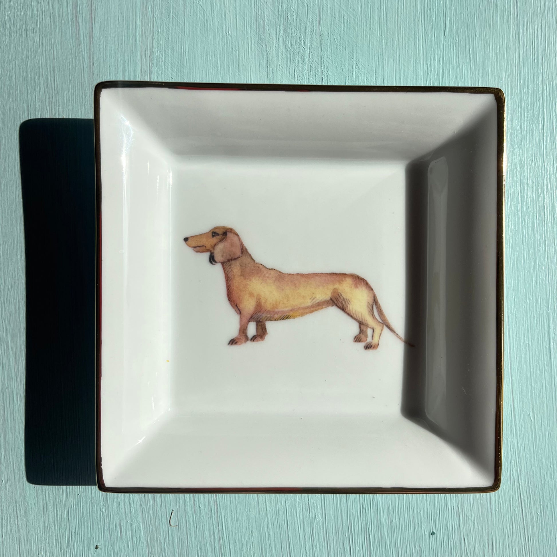 Quadratische Porzellan-Schale mit Dackel Motiv und Goldrand.